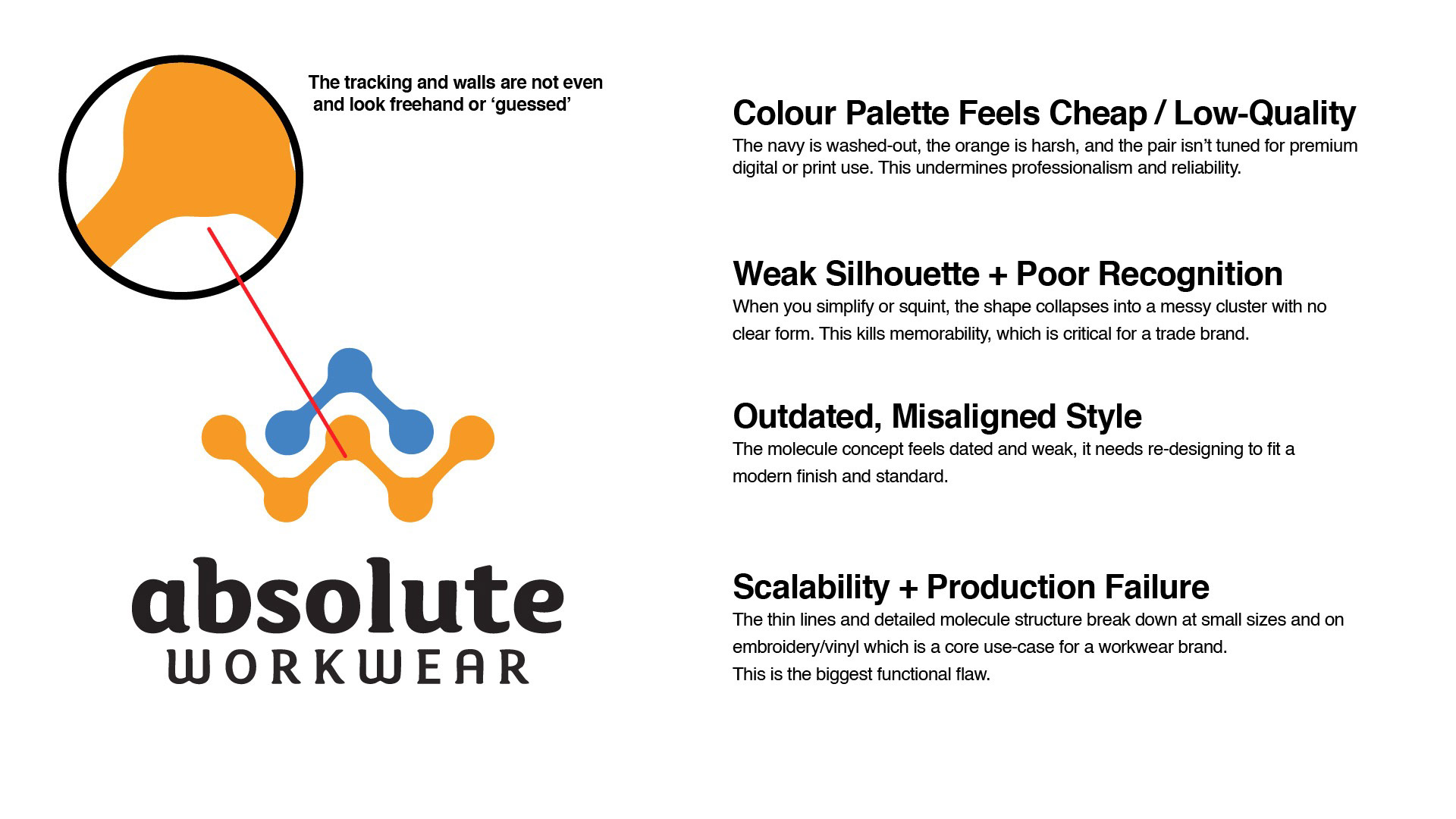 Brand refresh for Absolute Workwear, modernising an existing 10 year old logo while retaining core identity. The project focused on refining the mark, improving typography, upgrading the colour palette and creating a more versatile, professional logo system suitable for web, print, embroidery and signage.