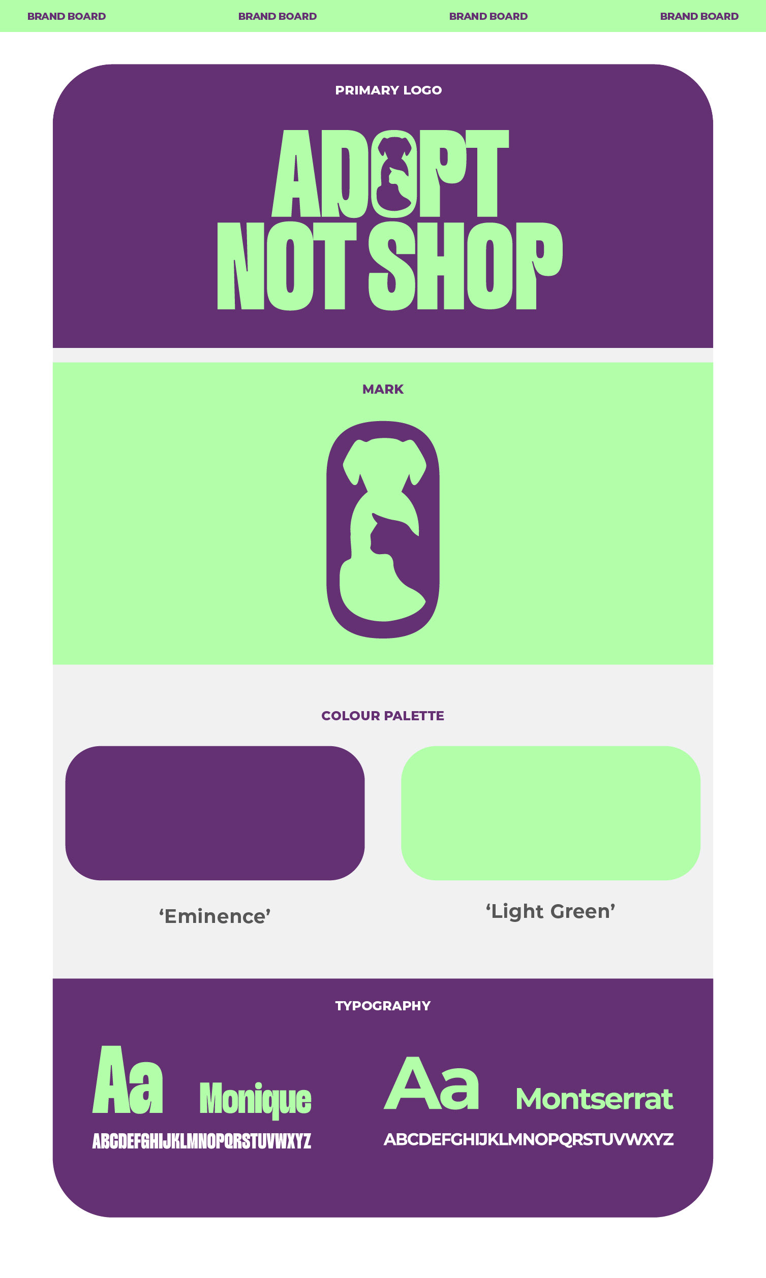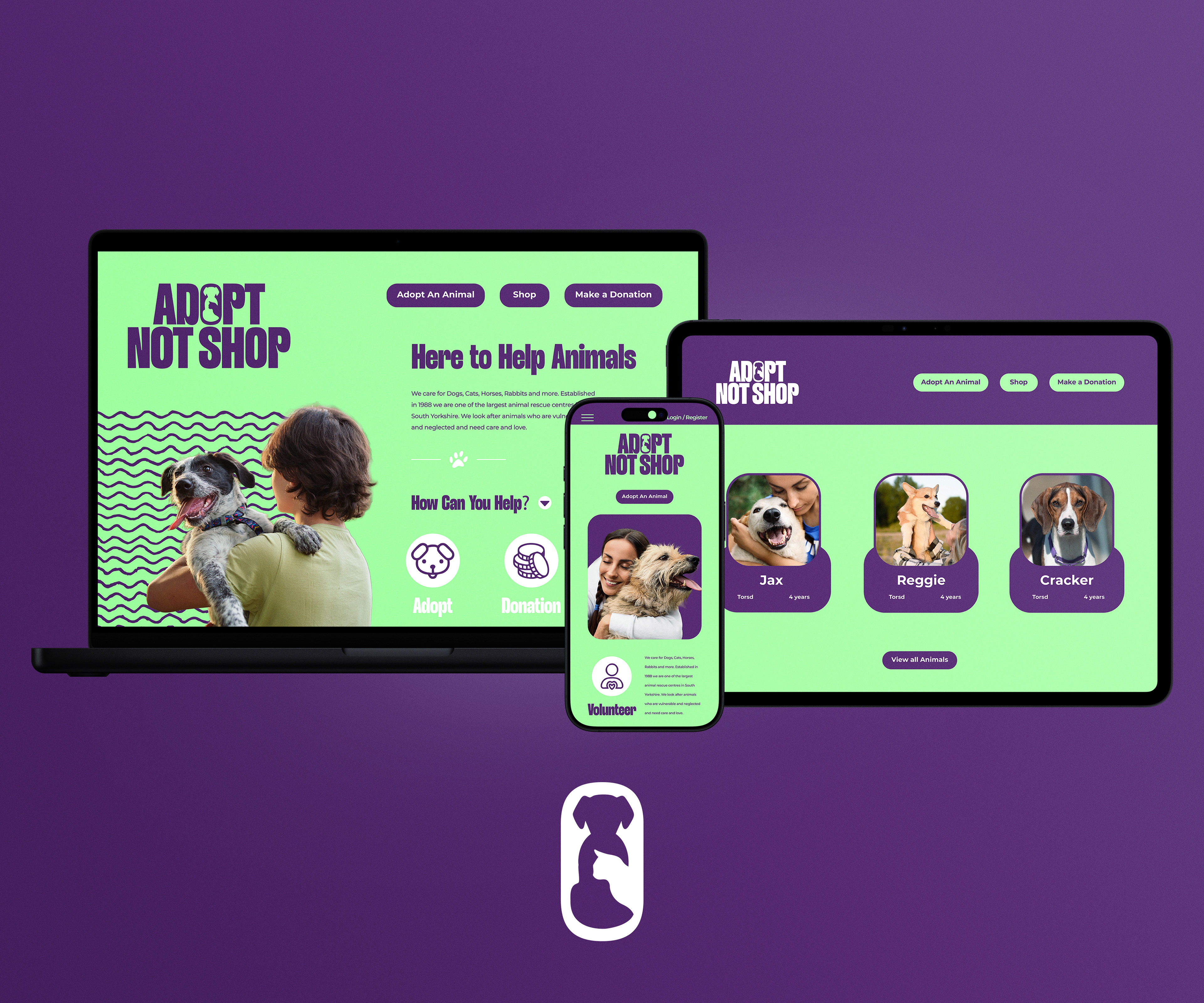 Here you'll see the brand identity I designed for Adopt Not Shop. A clean, approachable logo, refined typography, and balanced colour palette that communicate trust, warmth and innovation for a UK based pet adoption platform.